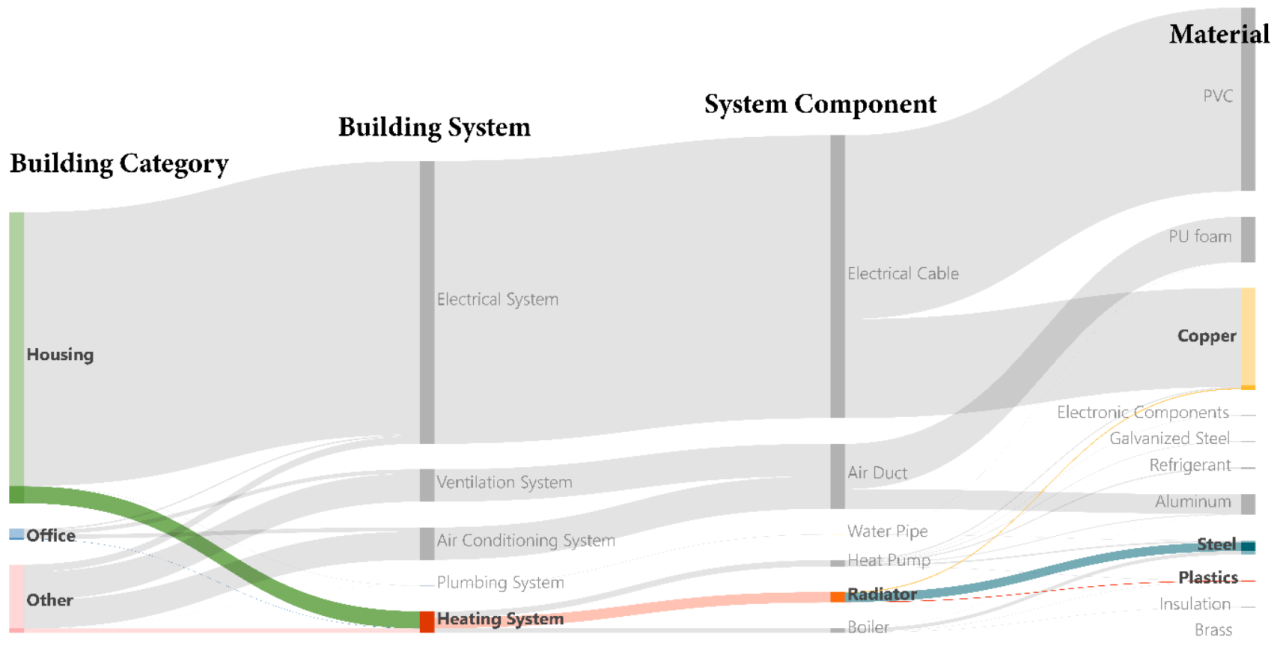 - We map secondary resources in the building stock over time and space. This includes a quantification of component/material inflows (demands from new constructions/renovations) and outflows (availability from dismantling/renovations) into and out of the building stock. This includes the built structures as well as the building systems (e.g. heating/cooling systems). [Science & Engineering pillars]