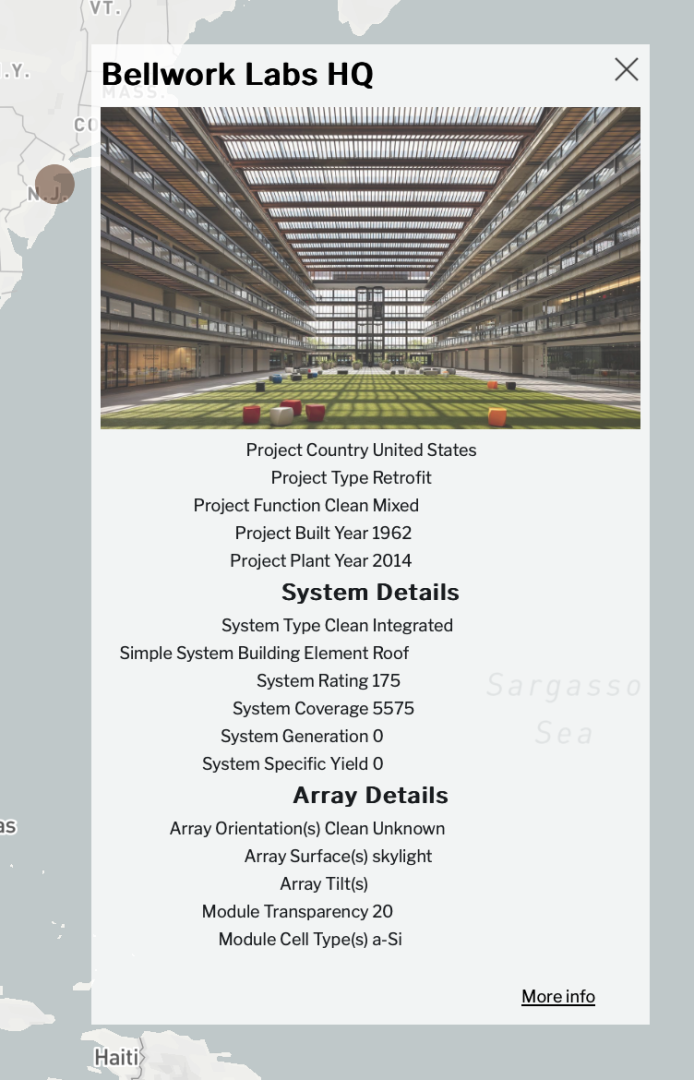 This repository serves as a collection point for buildings and infrastructure have integrated solar energy technologies, most prominently building integrated photovoltaics (BIPV). The repository can be explored through a map tool with basic filtering functionality. Along with the map explorer we have included a set of plots to explore the projects through their performance and inherent characteristics (i.e. type of project, annual yield, system efficiency, etc.). As the repository explorer is expanded more projects will be included as well as resources for various audiences, such as design booklets for BIPV or reference materials for engineering standards.