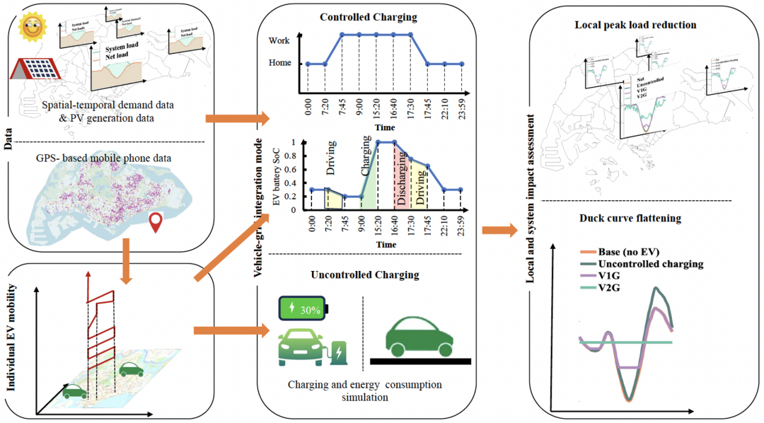 The tropical climate in Singapore presents a unique challenge for renewable energy integration due to its highly variable weather conditions, including frequent thunderstorms and rapid cloud movement, which result in fluctuating PV output. In response to this challenge, the Mobility WP explores the integration of EVs with PV energy to enhance grid stability. EVs are charged using renewable energy from PV systems and act as mobile energy storage units that can discharge electricity back into the grid using Vehicle-to-Grid (V2G) technology. This bidirectional energy flow is crucial for flattening the inherent fluctuations in PV generation, particularly during periods of variable sunlight. The demo showcases how this dynamic system can mitigate the adverse effects of these fluctuations, improving the overall power quality and ensuring a more stable energy supply.