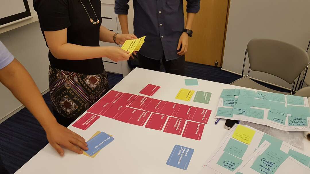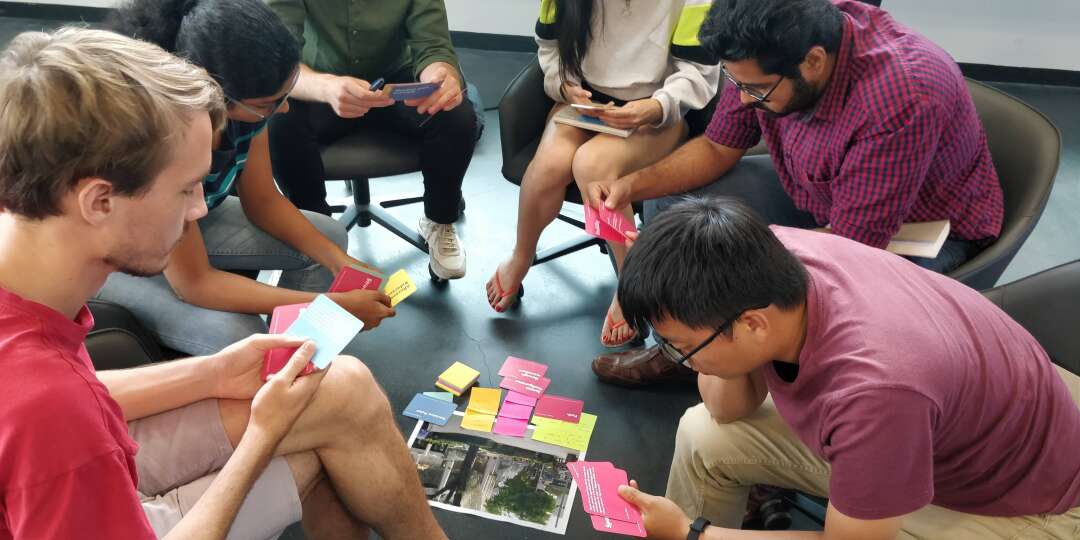1. Spatial Cognition Thinking cards organised thematically by practitioners and used to structure a discussion on user behaviour in complex buildings. 2-3 Group of multidisciplinary students, using the Spatial Cognition Thinking cards to discuss which aspects of spatial cognition can help understand people’s behaviour in a major pedestrian street. Saskia Kuliga 2019