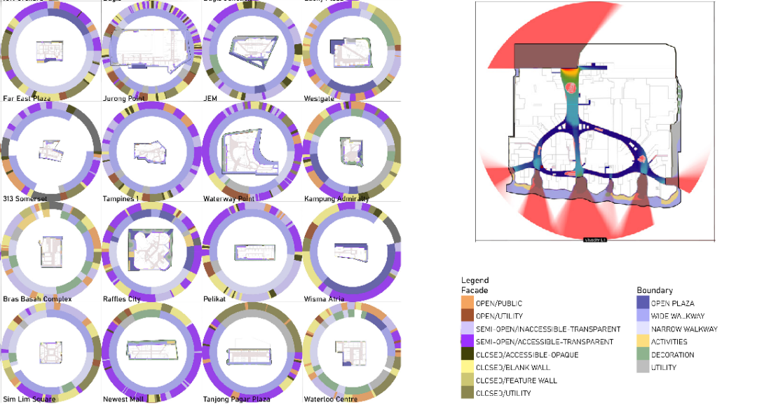 The donut charts illustrate the allocation of the facade (outer ring) and the building boundary (inner ring; i.e. between the facade and the plot line) to different types of functions. The joint presentation of the two rings allows the comparison between the function of the facade and the public space in front. Mavros, Zhong and Hölscher (2022)