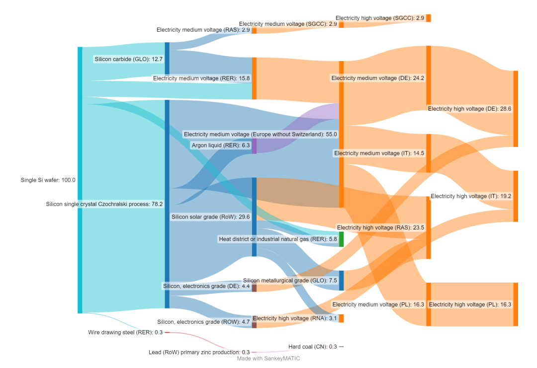 Photovoltaics (PV) are not just “green” and sustainable; they come with a backpack of materials and embodied emissions incurred during their manufacturing. This Sankey diagram shows the influential processes (in %) in the Single Silicon wafer production if produced in a European power grid. It becomes apparent that manufacturing PVs becomes more environmental if also “green” electricity is used in their production. EU-produced Monocrystalline solar panels are estimated at 250 kgCO2eq/m2 embodied emissions. Assuming standard test conditions and a lifetime of 20 years, this translates to an equivalent of 62.5 g of CO2eq/kWh of PV electricity. Comparing it to the 900 g CO2eq/kWh of coal electricity, this sounds like a really good deal! Even when comparing it to the 2022 average grid emissions in Switzerland of 125 g CO2eq/kWh (due to nuclear and hydro).