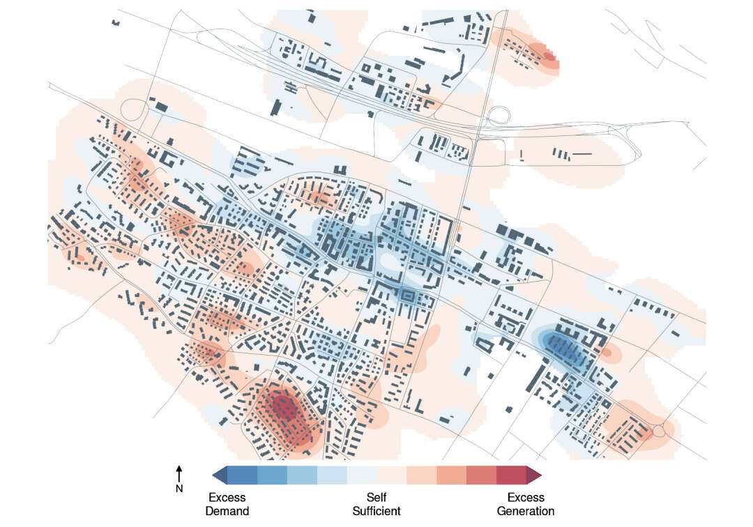 Where we need electricity might not always coincide with where we can generate it efficiently. The figure shows the difference between local building electricity demand and local solar electricity generation potential for the district of “Altstetten” in Zurich. Spots with low differences (“Self Sufficient”) indicate that we can approximately generate as much solar electricity as we need, high positive differences (blue) indicate that we require more than we can locally produce, and high negative differences (red) indicate that we produce more solar electricity than we locally require. On a larger scale, such an analysis can support the planning of solar neighbourhoods and advanced energy communities (ZEV: Zusammenschluss zum Eigenverbrauch”).
