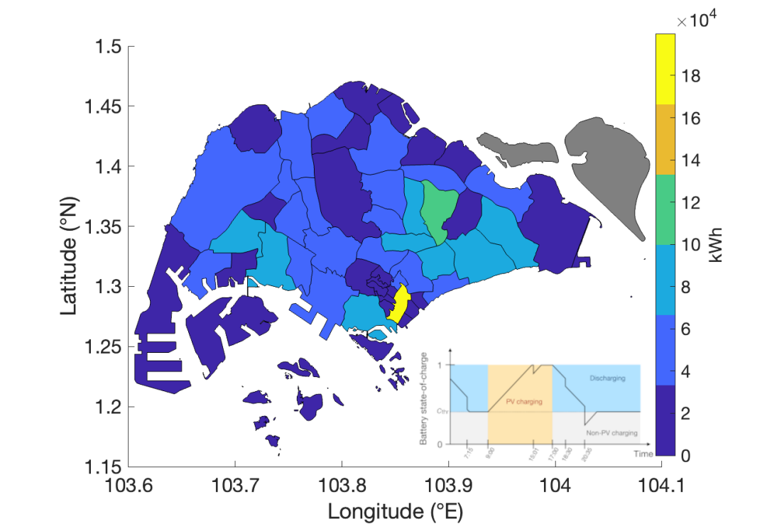 In regions with high existing solar energy grid penetration, the mismatch between demand and supply can lead to a problematic phenomenon known as the “duck curve”: It describes the discrepancy between renewable production and actual electricity demand. Latter typically surges towards the evening, which unfortunately also coincides with the time when sun sets and solar production halts. Therefore, this mismatch needs to be compensated by a sudden ramp-up of alternative (fossil-fuel based) generators, thus causing strains to the grid. The concept of using EVs for bi-directional charging is known as Vehicle-to-Grid (V2G). V2G can flatten the duck curve, as it offers controllable flexibility to the grid. The figure shows our estimations of the local energy supply by V2G in Singapore. The district shown in yellow is Downtown and offers the highest potential due to the many EVs frequenting here.