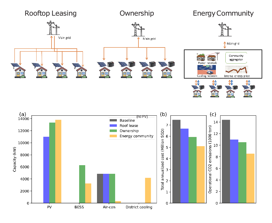 How does a smart organization of solar energy influence the decision making in the private sector to invest into PV? Energy sharing in solar communities, local self-consumption, and smart operation of battery electric storages can all significantly improve the profitability of distributed energy resources (DER). Furthermore, different business models have consequences on risk assessment and return-of-investment and should be chosen depending on the context: Is it better to lease your roof to a utility at little risk, or is direct ownership the better model? What are the overall benefits of organizing neighbourhoods into energy communities and which market mechanisms (such as dynamic internal prices) are necessary? The figure shows the differences of various solar business models in Singapore and compares optimal DER capacities, system cost and operational emissions.