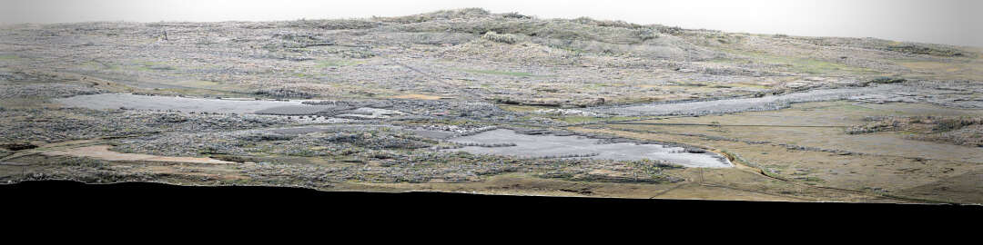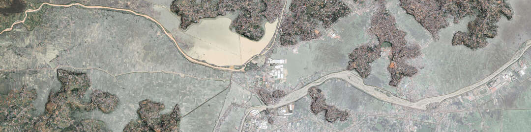 Pluvial floods fill the polder during the monsoon season, as can be seen on this orthophoto. Simulation of overland flow on point cloud models indicates how polders can be flooded during the rainy season or irrigated during the dry season (as shown here in black overlay). Simulation is integrated into the design process to produce functional scenarios.