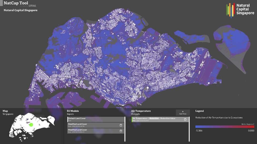 The NatCap Tool is an interactive, Singapore-oriented 3D platform that allows users to easily show and modify different types of raster-based landcovers and to calculate several different ecosystem services on top of those landcovers and to show those results. It also allows users to enhance the workflow with the ability to show and edit point clouds within the 3D space for more realistic visual representation and user experience.